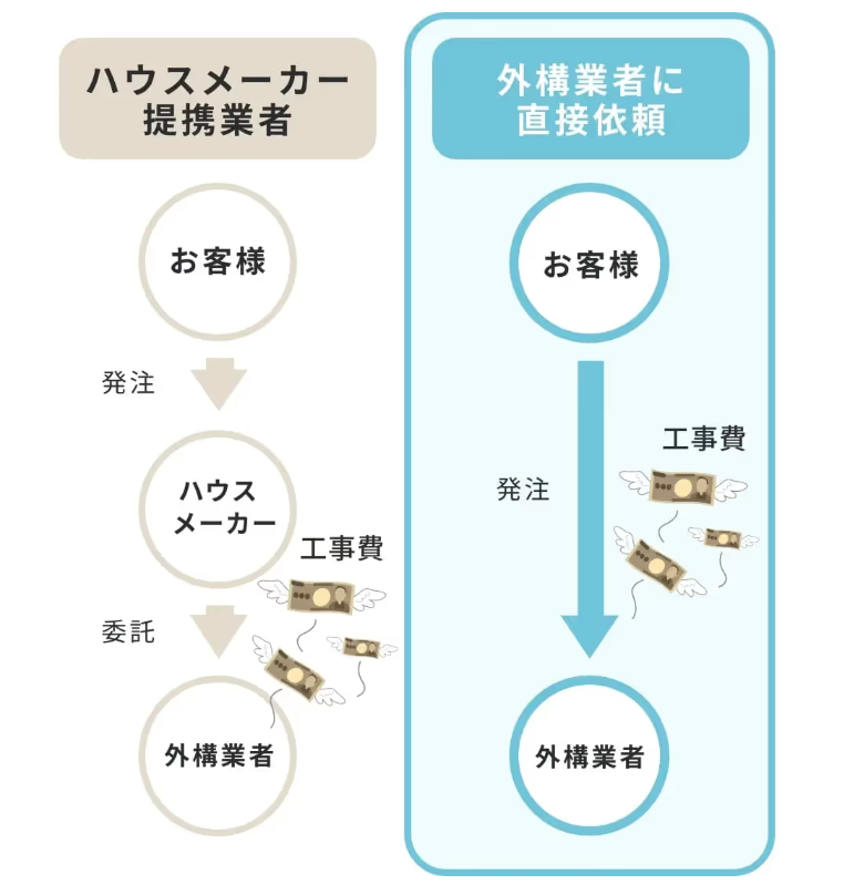 外構はハウスメーカーやホームセンター経由で頼むと手数料でそのぶん高額になってしまいます。