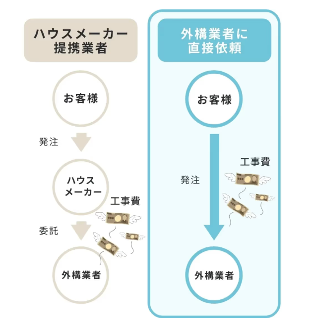 ハウスメーカーは外構も一括で請け負ってくれますが、実際に工事をするのは外構専門の下請け業者。この間に入る「紹介料」「管理費」「監督費」などの、10~40%ほどが上乗せされます。